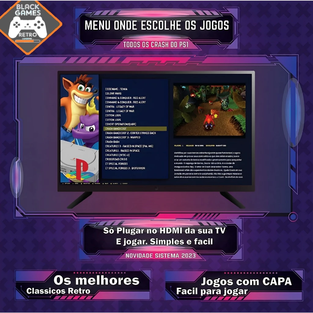 São mais de 140.000 jogos e 85 sistemas diferentes no Videogame Black Retrô... Isso mesmo, 85 videogames em 1! É jogo para se divertir a vida inteira!! Descubra jogos que você nunca conseguiu jogar na época de seus lançamentos, e até sistemas que você não teve a oportunidade de conhecer! Muitas surpresas inesperadas e esperadas (Donkey Kong, Super Mario, Mega Man, Sonic, Crash) que farão você relembrar e aproveitar ótimos momentos jogando.